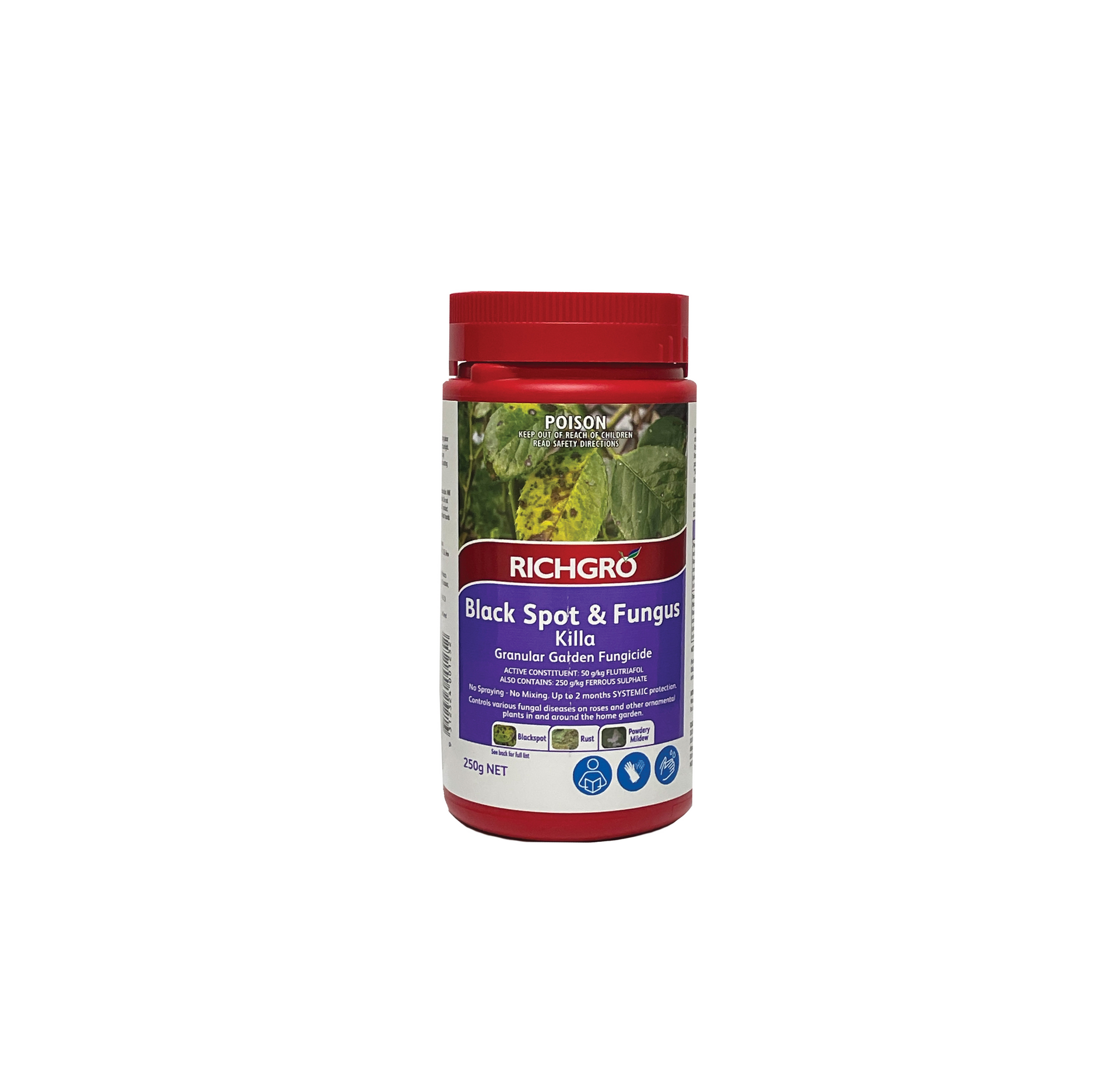 Protects roses and other ornamental plants from fungal diseases such as black spot, powdery mildew and rust. Black Spot & Fungus Killa is a systemic fungicide that is taken up by the plants roots to control diseases. It also contains iron and zeolite which are beneficial to plant health.