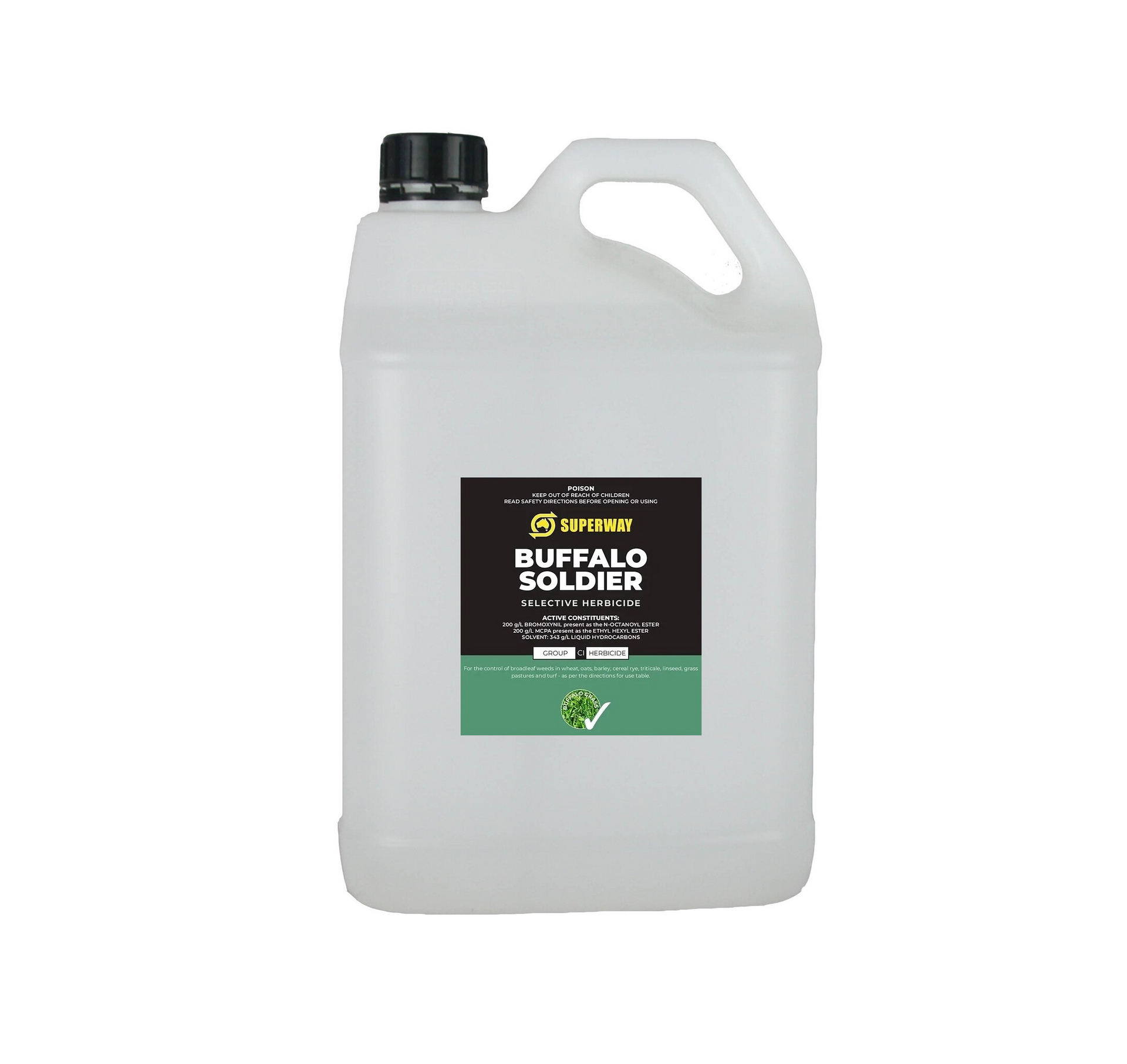 Buffalo Soldier is for the control of broadleaf weeds in wheat, oats, barley, cereal rye, triticale, linseed, grass pastures & turf (commercial) For the control of bindii, clover, oxalis & other weeds. This product can be used on buffalo, couch & Qld blue couch domestic lawns (domestic).